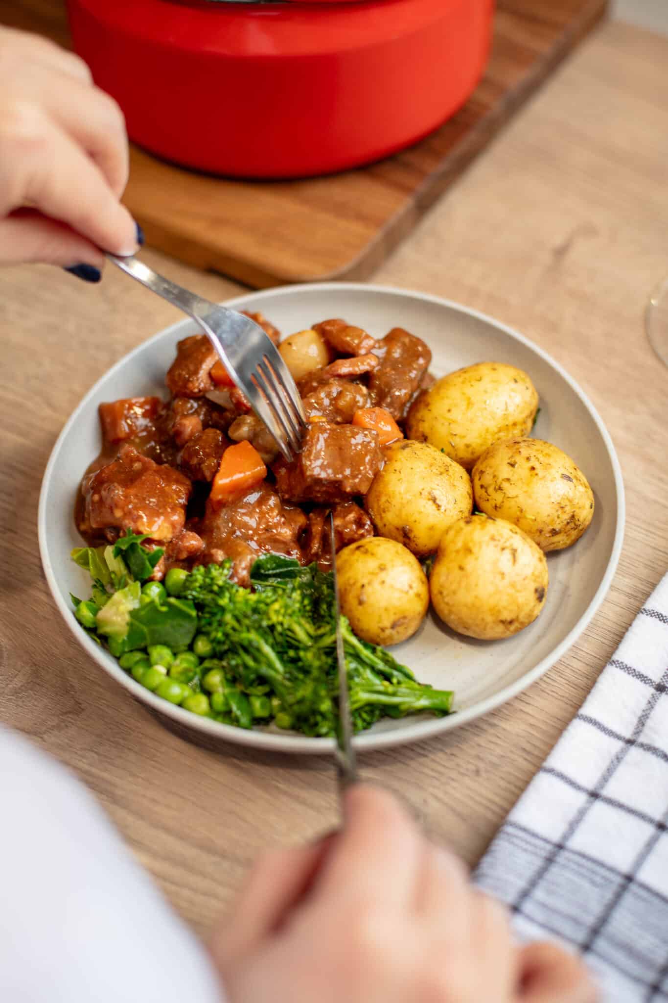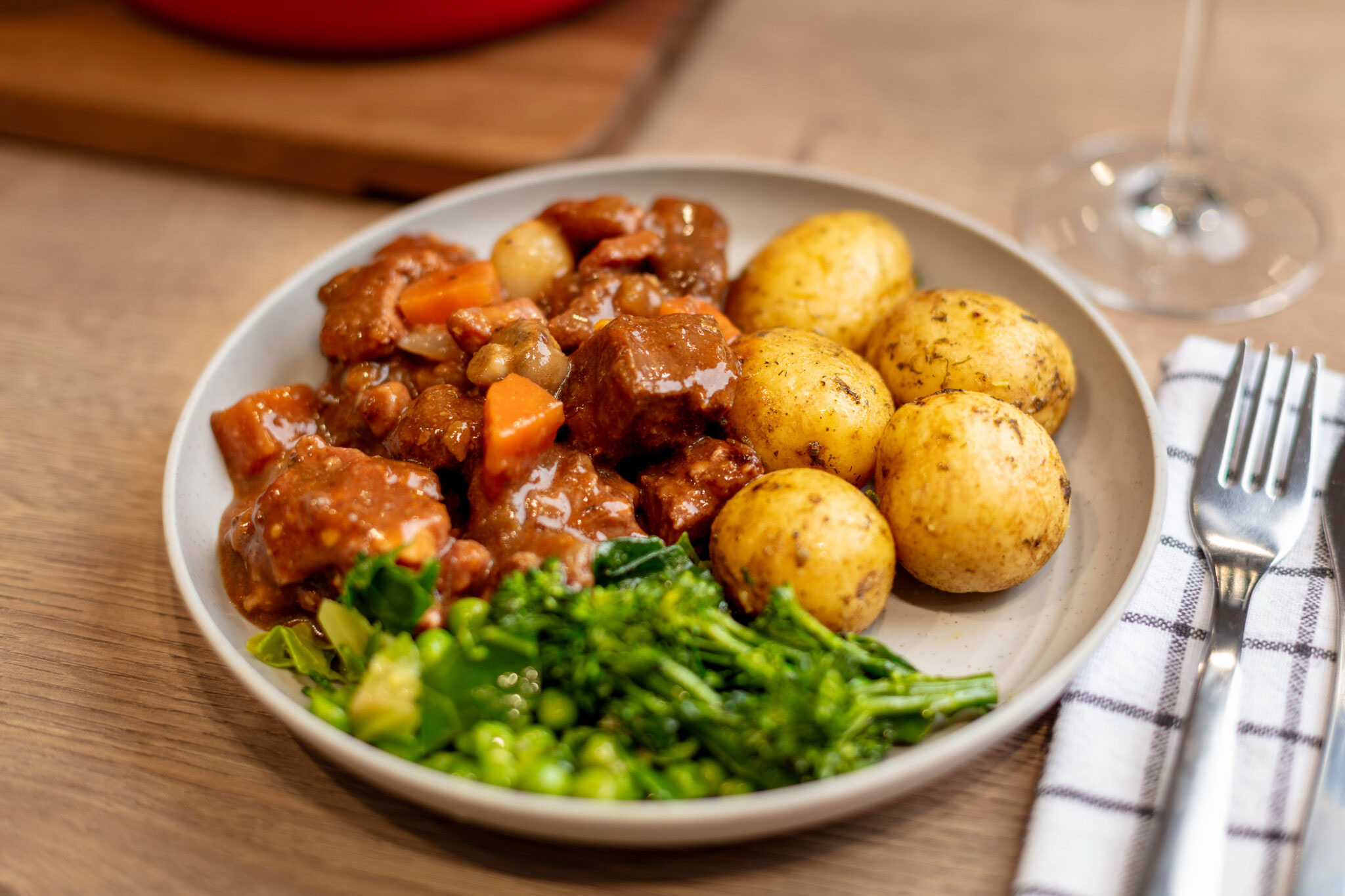 Beef (38%), Red Wine (Sulphites) 12%, Water, Onion, Mushrooms, Carrots, Pearl Onions, Smoked Bacon (Pork 92%, Water, Salt, Preservative (sodium nitrate, sodium nitrate), Antioxidant (sodium ascorbate)), Rapeseed Oil, Modified Maize Starch, Tomato Puree, Sugar, Wheat flour (Wheat flour, Calcium, Niacin, Iron, Folic acid, Thiamin), Garlic Puree, Salt, Barley Malt Extract, Thyme, Black Pepper.